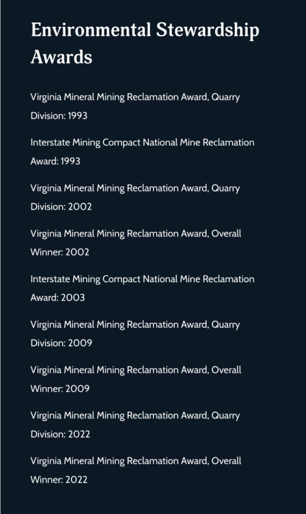 John:有的。在过去30年里,我们的复垦项目获得了多个州级和国家级奖项,这体现了我们对环境友好型采矿实践的坚持。1993年以及2002/2003年,美国蓝晶石矿业公司因贝克山矿区(Baker Mountain Mine)项目获得了弗吉尼亚州矿产开采复垦奖(Virginia Mineral Mining Reclamation Award)和州际采矿契约全国复垦奖(Interstate Mining Compact National Reclamation Award)。2009年,我们因将贝克山采石场(Baker Mountain Quarry)改造成带有低维护水处理设施的野生动物栖息地,获得了弗吉尼亚州矿产开采复垦奖的采石场分区奖和总体优胜奖(Overall Winner Award)。我们最近一次获奖是在2022年,因东岭矿渣填埋场(位于东岭以西)项目获得了弗吉尼亚州矿产开采复垦奖的采石场分区奖和总体优胜奖。